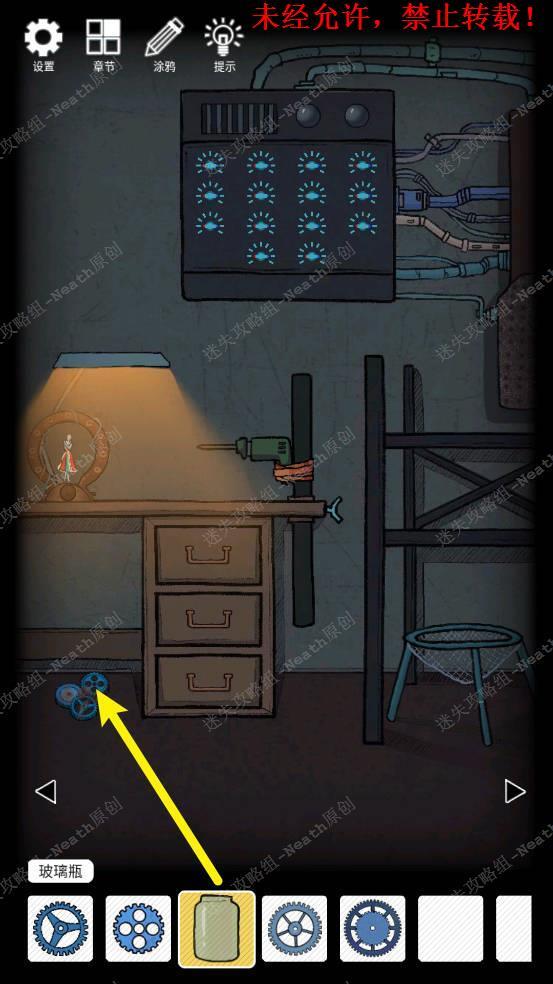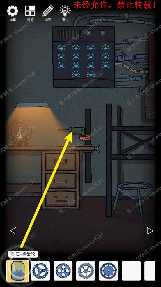 45、到台灯场景,把【钢管】放到工作台上,放上【电钻】使用【胶带】绑好,使用【玻璃瓶】装地上的【锈齿轮】。45 45.1