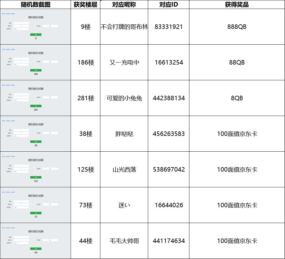 活动截至时有效楼层为284楼,经随机数抽取获取获奖楼层和名单如下: