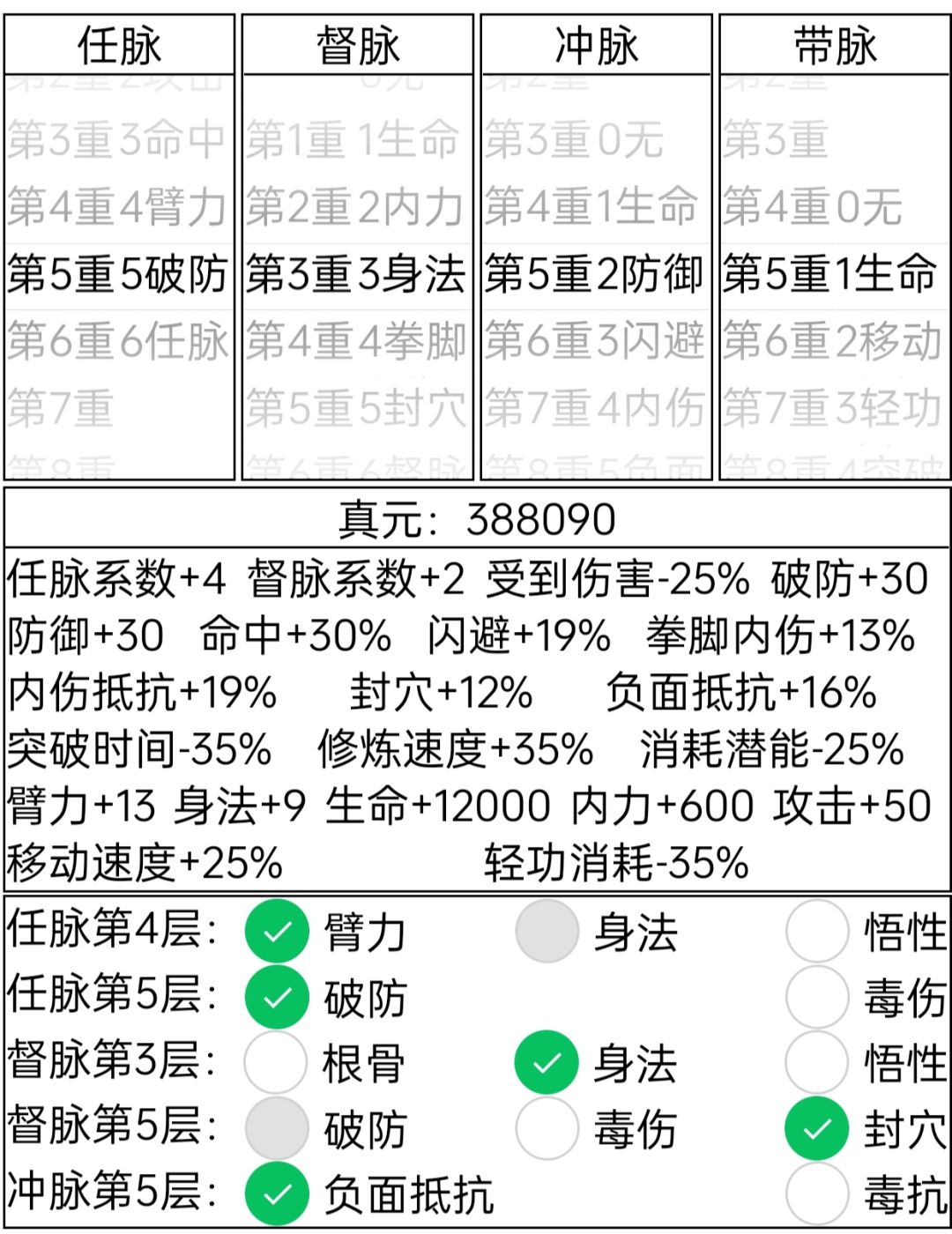 因为这篇攻略是保证在游戏体验舒适的情况下进行真元的选择,所以五破五防四级带是刚需,也就是说我推荐的三轮最低真元为38.8w