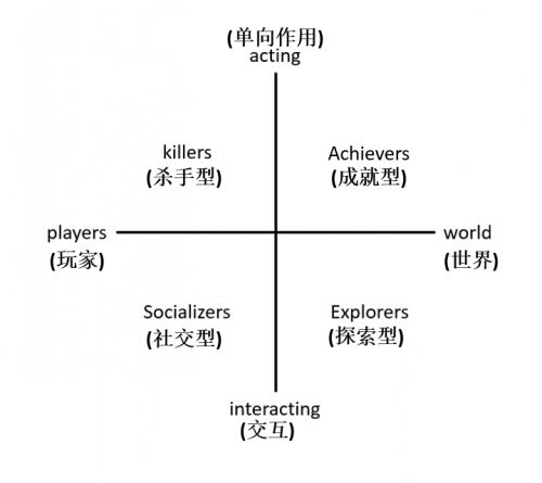 他在《红心、梅花、方块、黑桃:MUD游戏玩家分类》一文中从玩家需求上将玩家分为四种类型:Killer(杀手型玩家)、Achieve(成就型玩家)、Explorer(探索型玩家)、Socializer(社交型玩家)