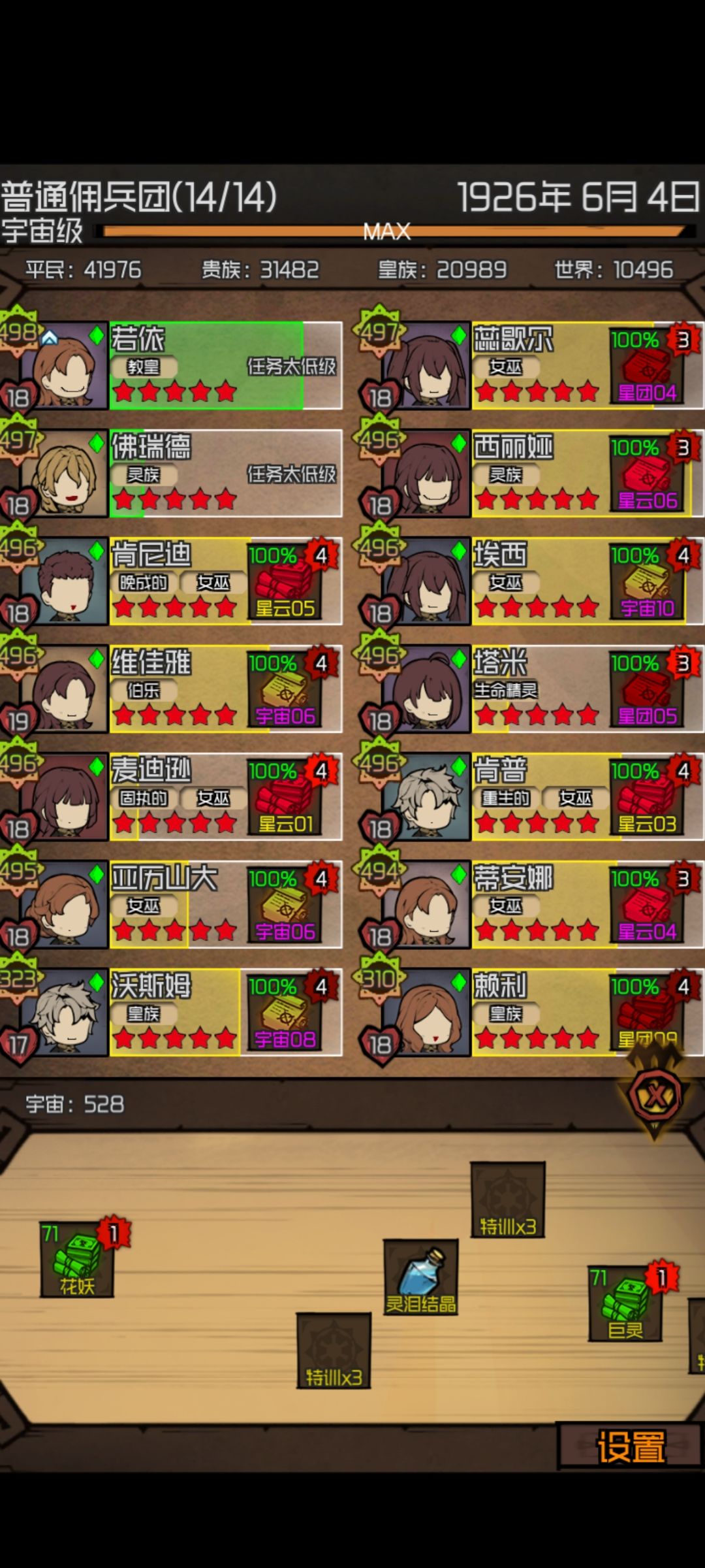 以下是我的佣兵团,已通关,彩星,阵容强度适中。(本人是稳健流打法。)