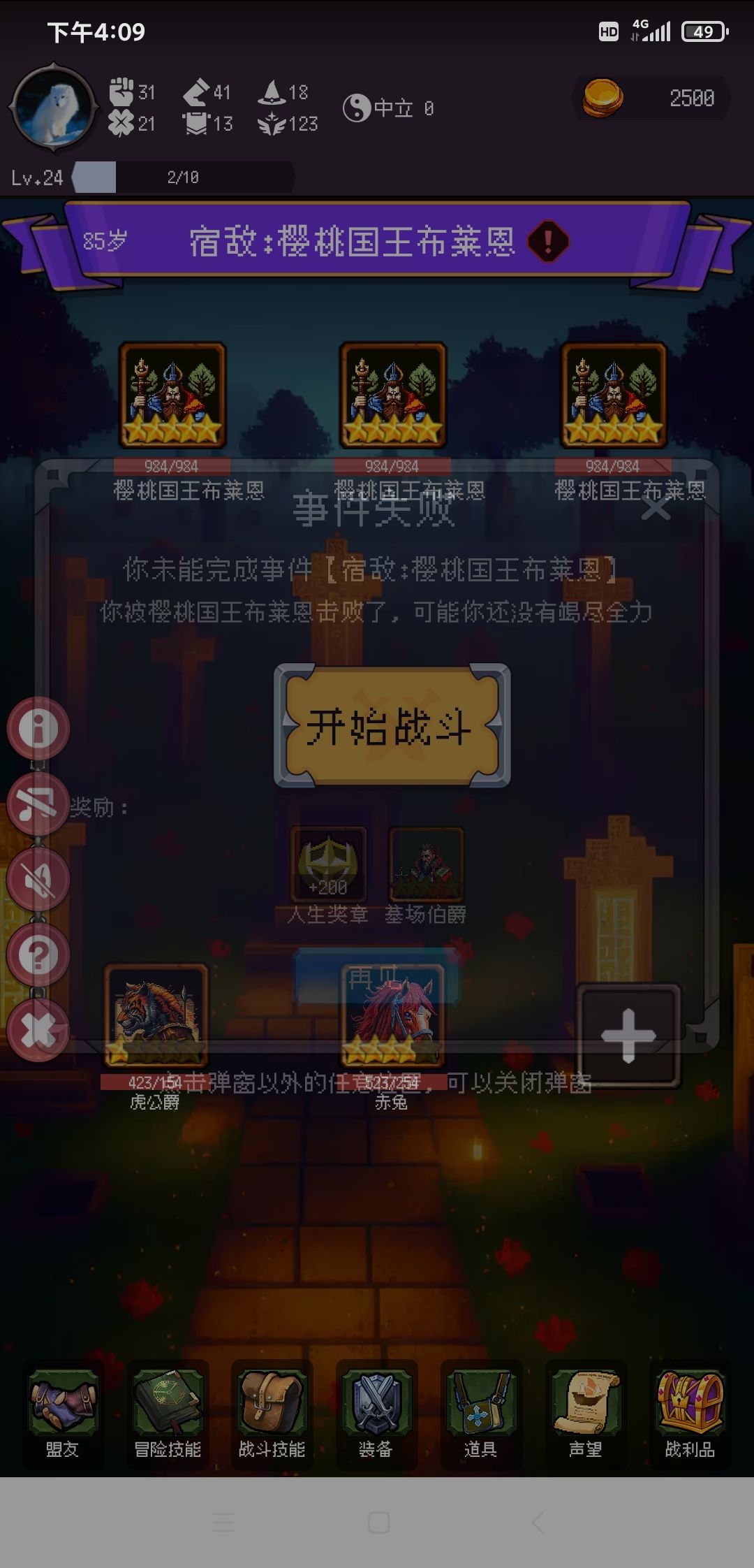 除了宿敌对战,其余战斗事件一律左下角快速胜利。