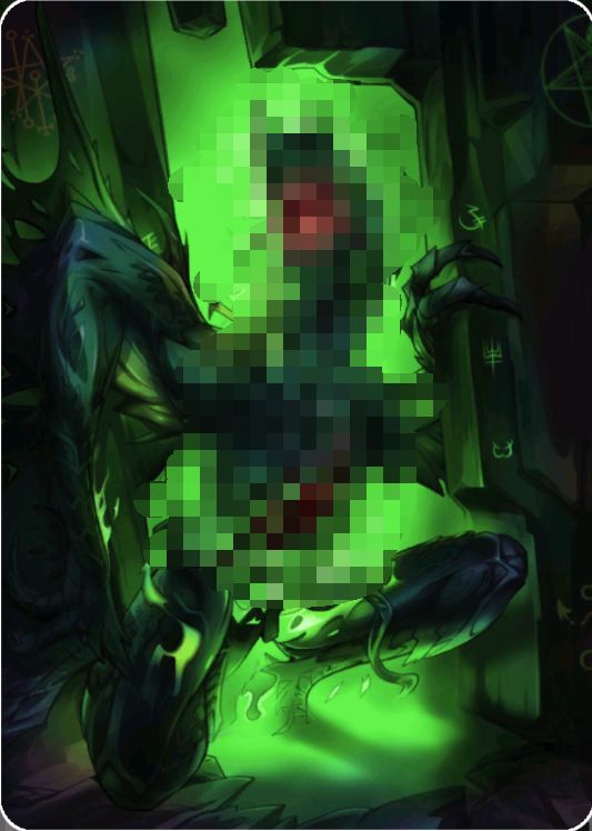 6月新出的吞灭卡,丑出天际,避免吓到小朋友我这里打码了。技能1/3概率给灵隐,1/3概率吞灭,1/3概率转化成50级的沃兰兽*翠蚀。给敌方灵隐对于恐吞队来说无关紧要,剩下的2/3概率都是好的,但没有封灵的保底让格温始终差七七一筹。但格温也有优点就是可以处理免吞的敌人,把敌方变成绿蛋后再吞掉。配队在上文恐吞队配队中。