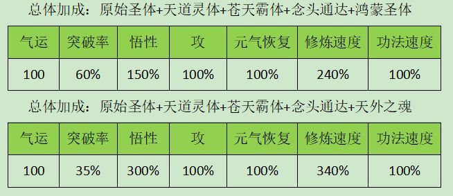 气运大于100最佳境界突破率大于25最佳悟性大于250%双攻/双防尽可能多元气恢复尽可能多,照这个标准我们选出一套最强天赋组合:原始圣体(红)+天道灵体(橙)+苍天霸体/龙霸战体(粉)+念头通达(紫)