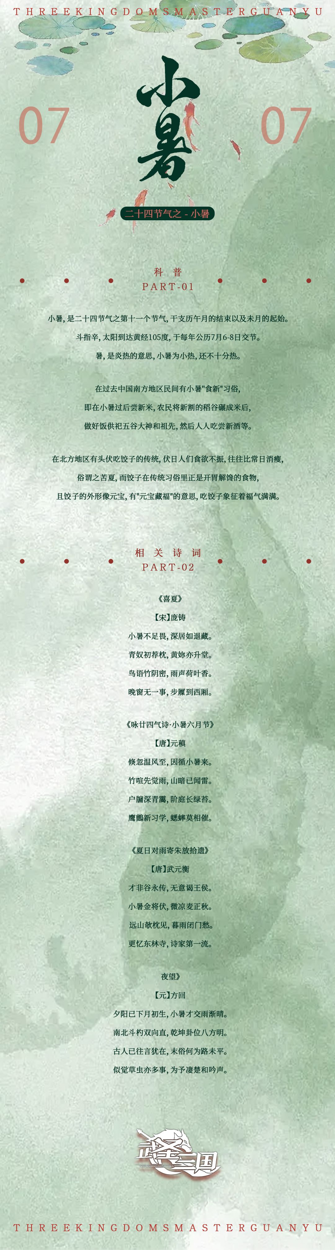小暑,是二十四节气之第十一个节气,干支历午月的结束以及未月的起始。斗指辛,太阳到达黄经105度,于每年公历7月6-8日交节。暑,是炎热的意思,小暑为小热,还不十分热。