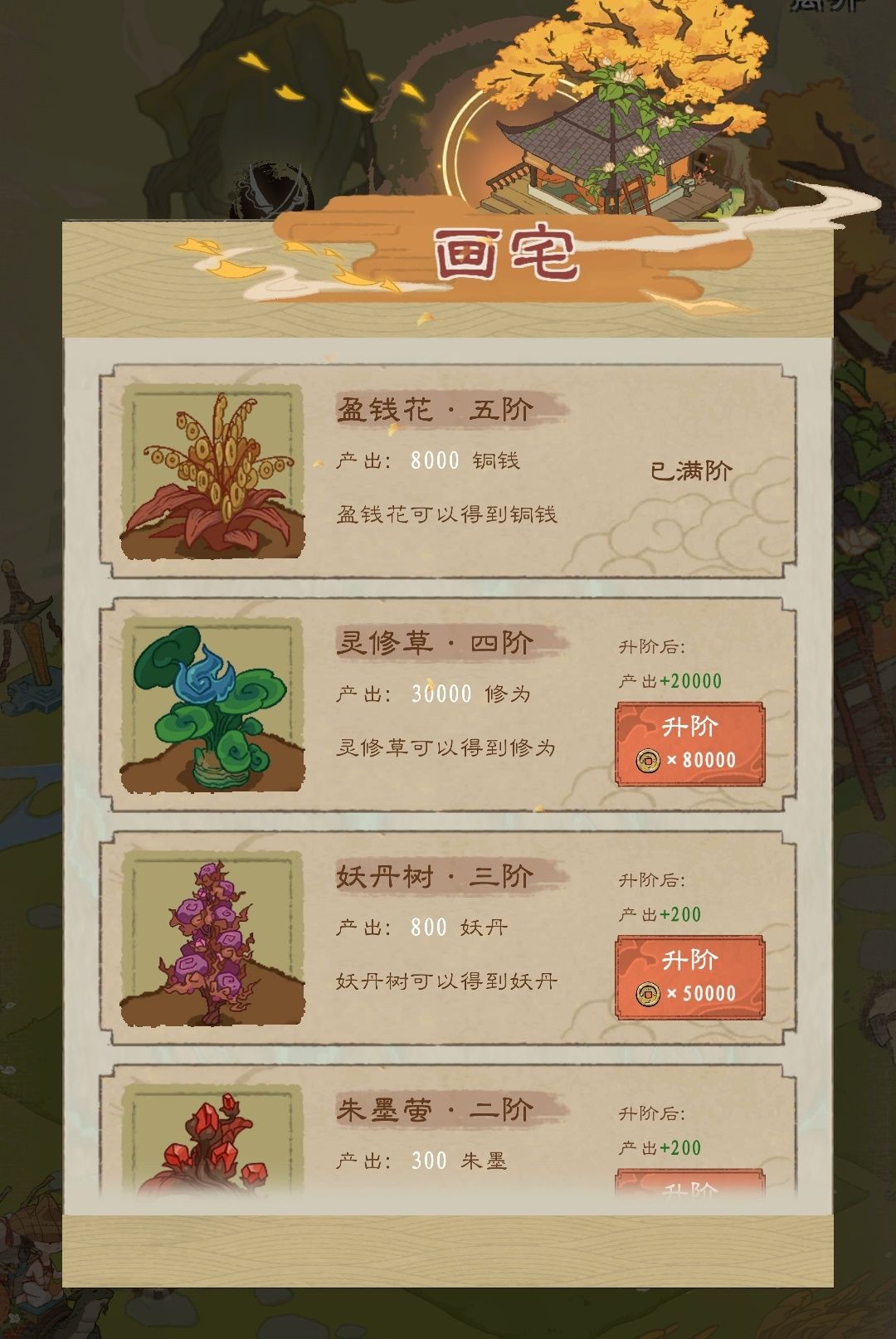 除此之外,还可以在「画宅」中使用铜钱进阶「修行作物」,同样的种植时间收成能翻几倍哦!