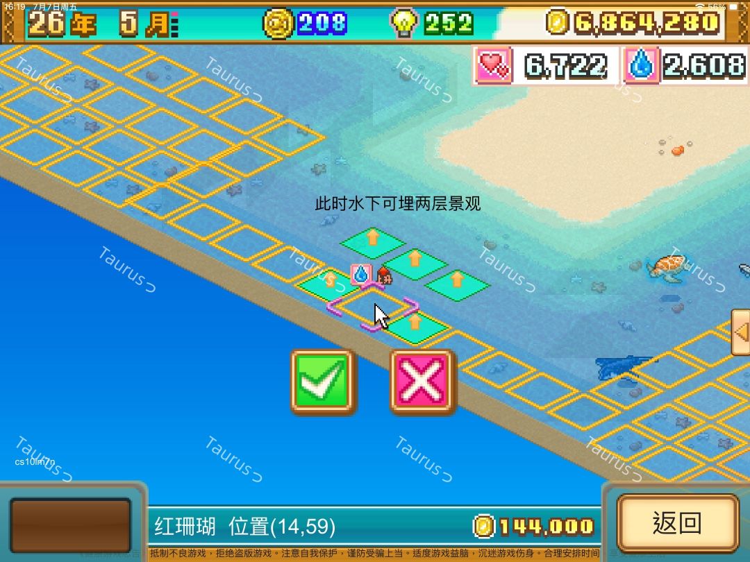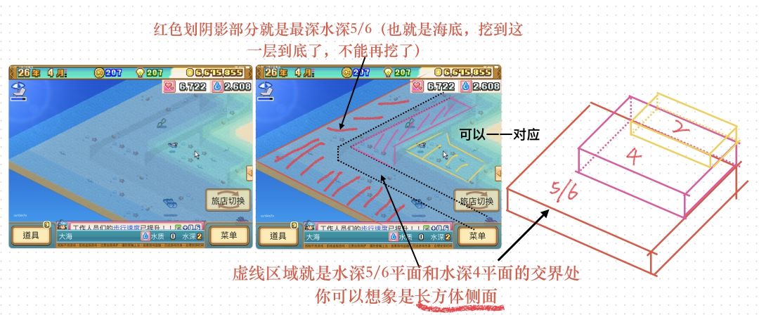 理解了地形原理后以及挖地方法后,我们知道最下面一层为水深5/6,那么只能水深5/6→4→2这样一层一层往上盖(不要问水深1 3为什么不管,我们只盖平面,不盖交界处)