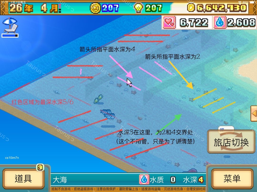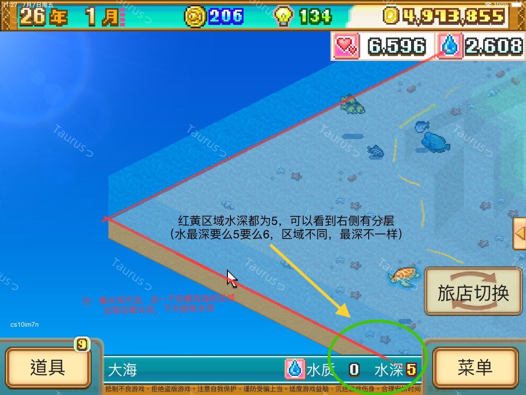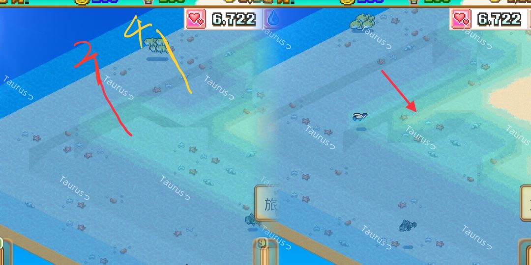 方法二:通过编辑区域看水层(此方法适用所有形状水层,而且不会看花眼,只需要看编辑区域颜色即可,编辑区域只有橘黄色(海底,水深5/6)、黄(水深4)、浅黄(水深2))