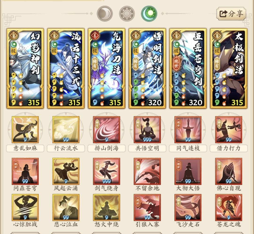 4、悟明剑法:降对面聚气加御剑增伤,不留余地首轮加吸血和化劲的buff,一般对面主要输出武学就在这个手位附近,化劲很有用,二轮的时候配合前面的问鼎连击buff六十连击率悟明还可大概率连击,悟明剑法的伤害值也很高,引狼四系增伤和加二十聚气。