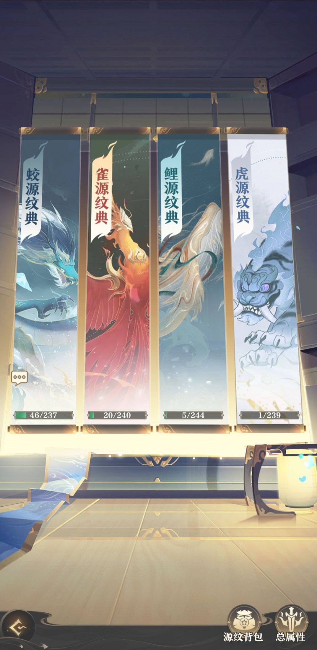 源纹典是天骄们为所有源师提供基础属性的主要途径之一,源纹典共有4本,分别为蛟、雀、鲤以及虎源纹典。