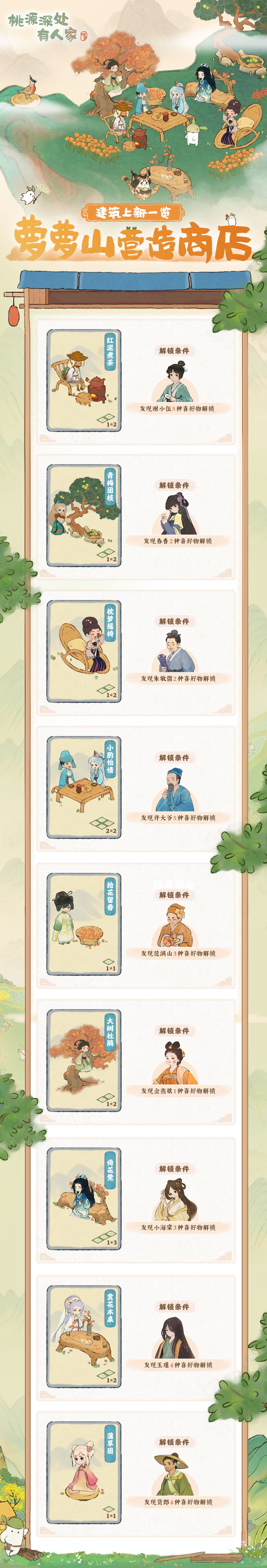 本周萝萝山的营造商店久违地上新了许多交互建筑,萝卜听说后立刻就来给山民们带来了更多的消息!