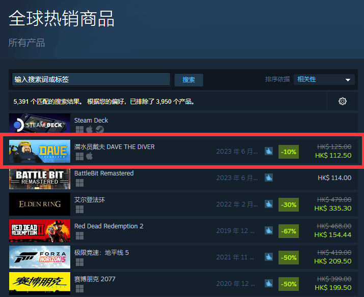 根据Steam全球热销榜,近期发布的热门游戏《潜水员戴夫》登顶游戏类第一名,超过了像素版战地《BattleBit Remastered》和《艾尔登法环》。