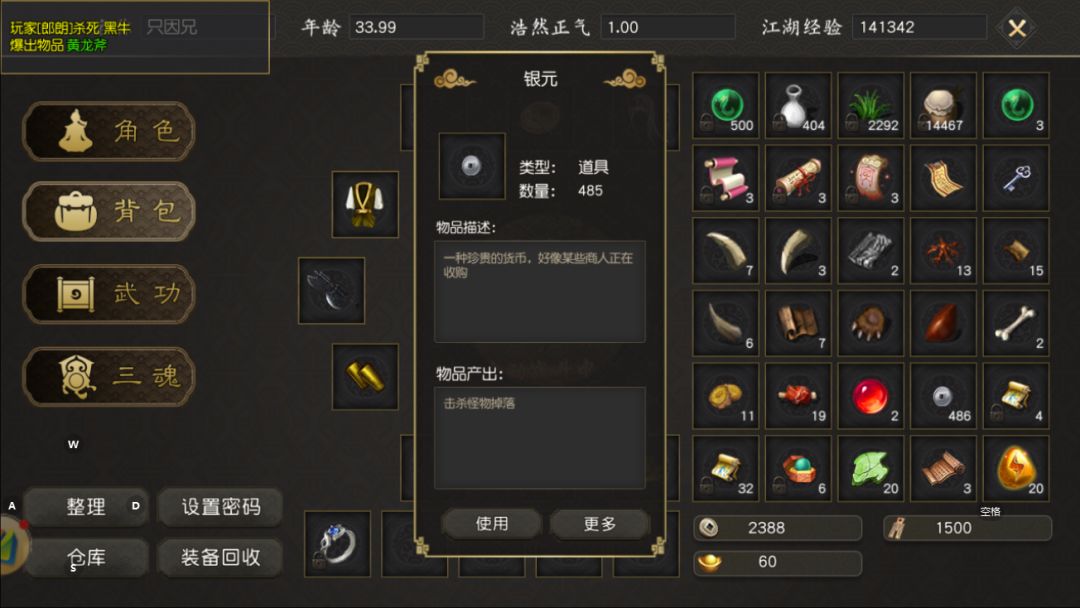 打开背包,进入眼帘的便是最下面的三魂系统了。打开之后就有人要问了,这个三魂的真元和江湖经验应该怎么弄?先说说真元吧,真元需要我们用满级武功去兑换,换完之后,武功消失。不过因为最好是在刚开始前七天这样做,因为首冲的几把练级武器再吃双倍经验丹,练满武功真的很快