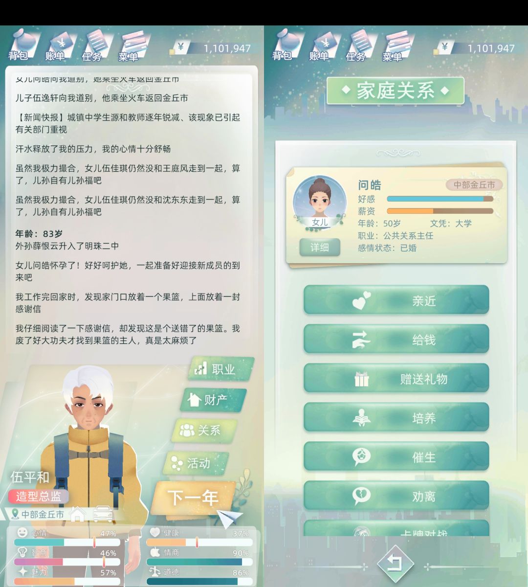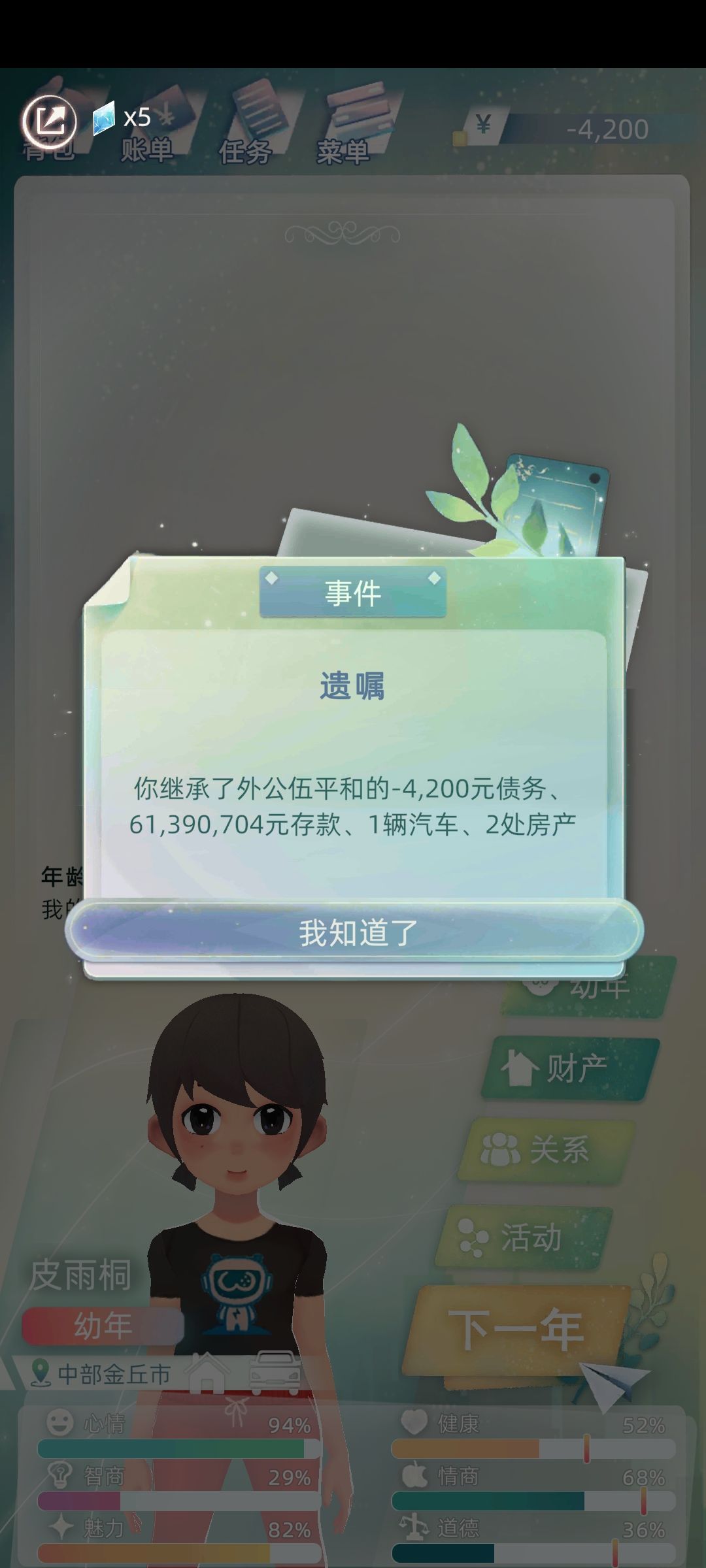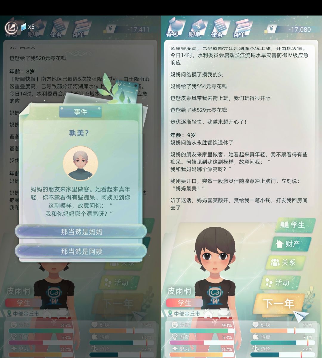 开局父母双全,还有一个后来当了程序员的哥哥。小时候在公园里认识了童年的青梅夏岚,她很喜欢我,可惜我嫌她毕业后薪水低微,结婚时新娘不是她。直到40岁她依然单身,41岁才和别人结婚。我们晚年仍保持友谊。