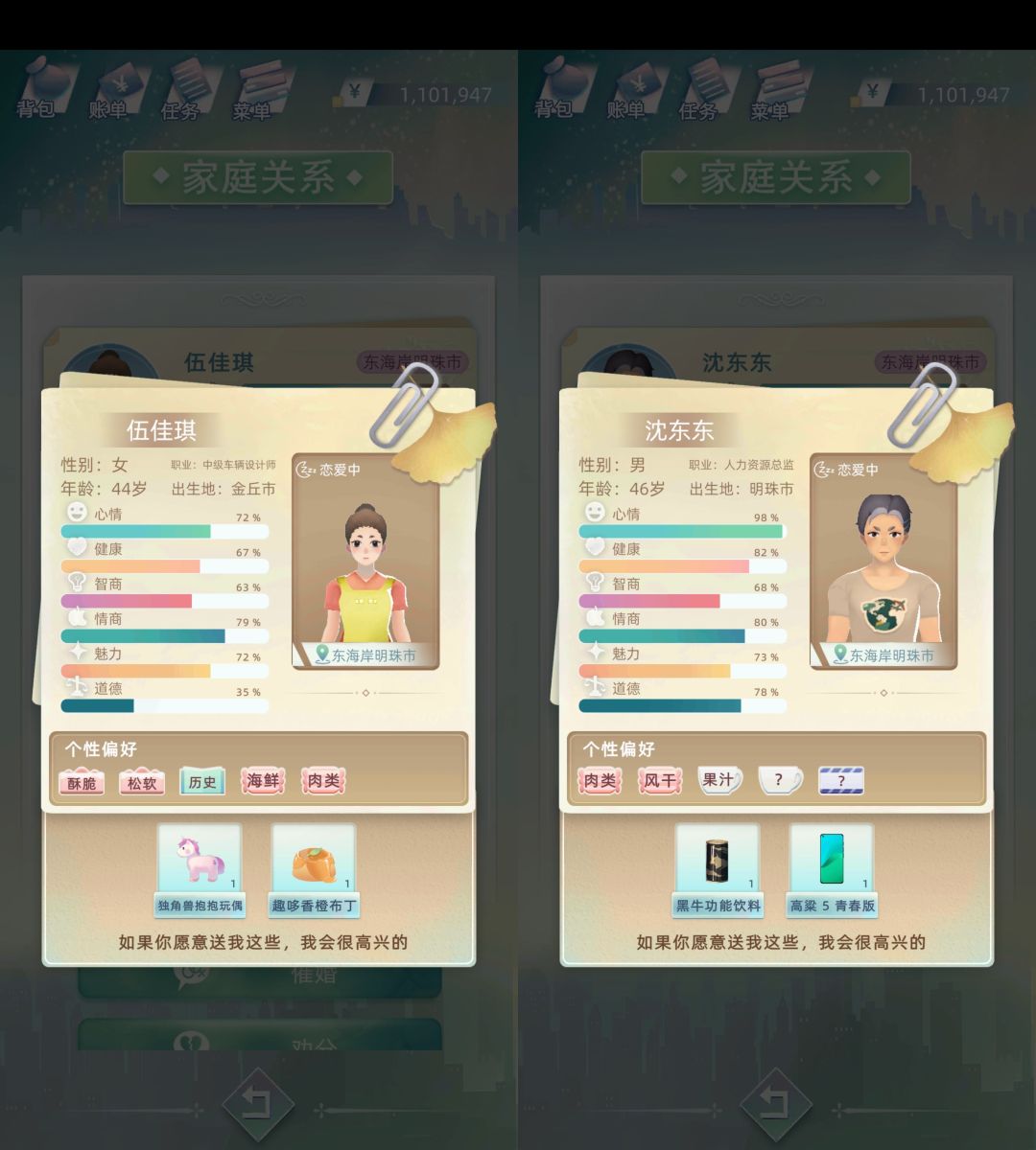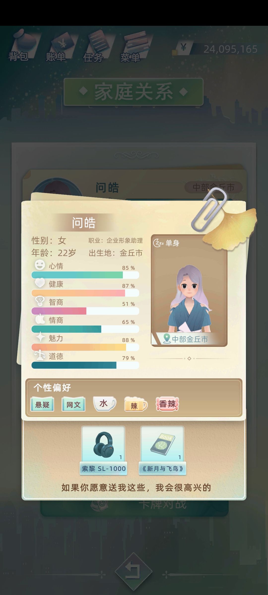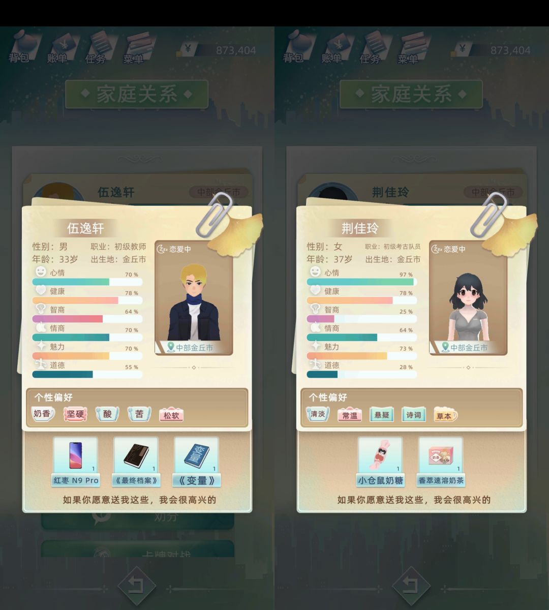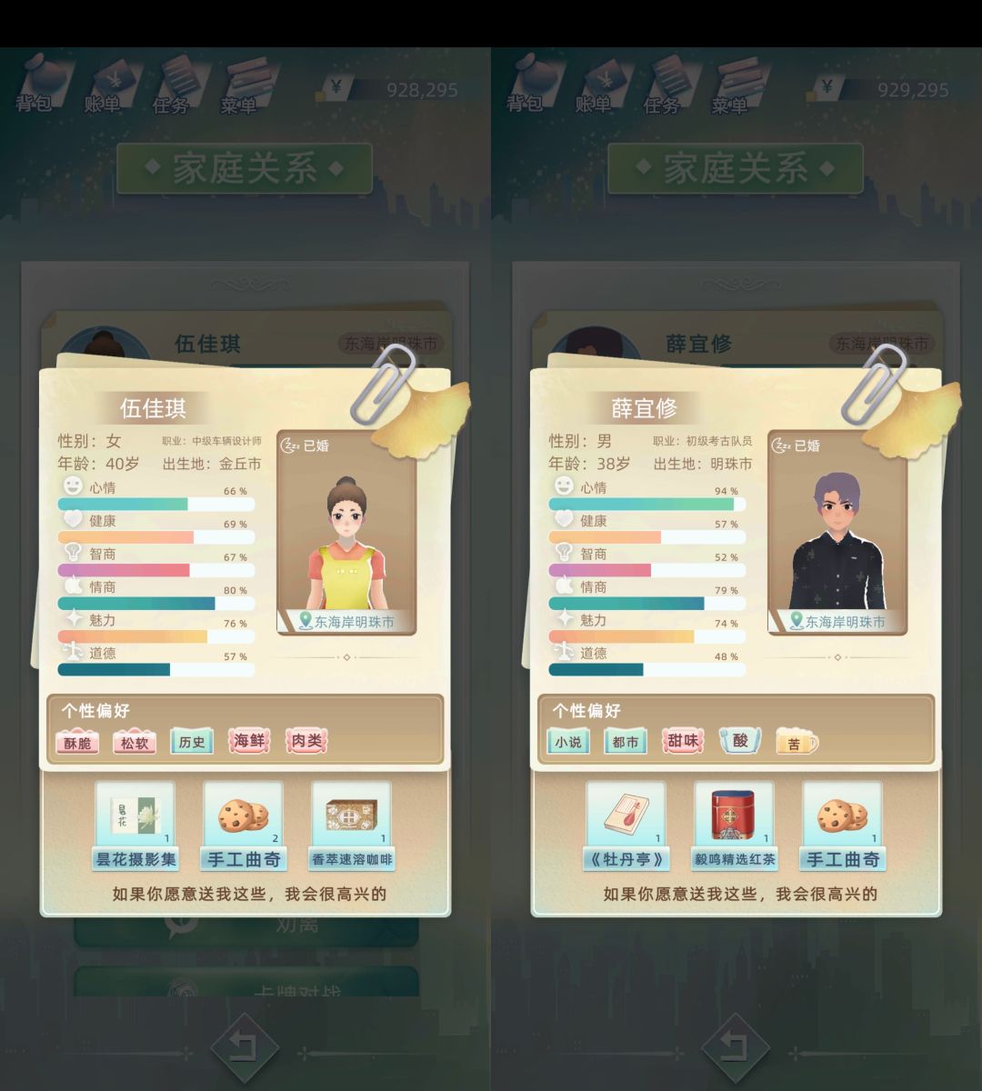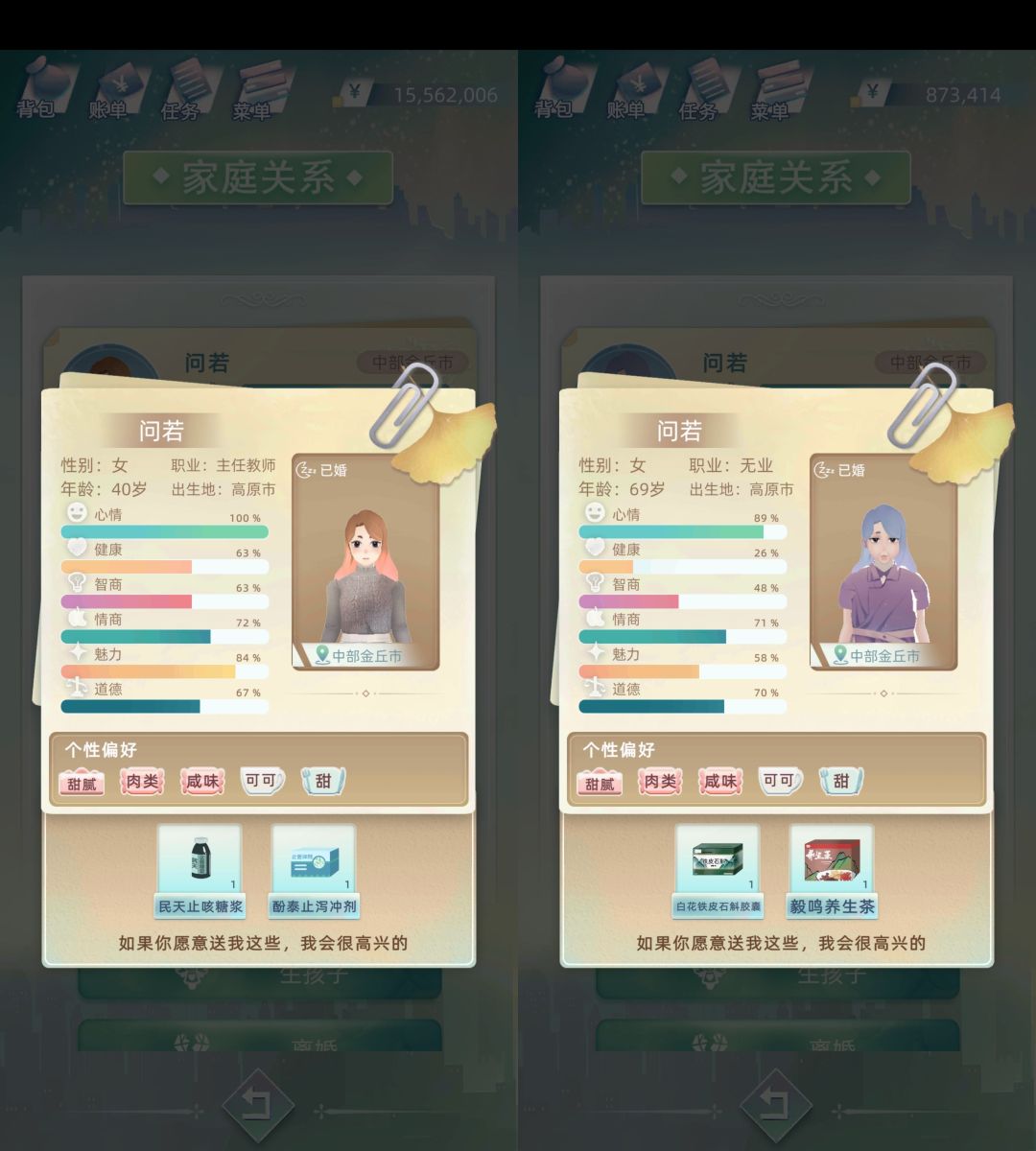 老婆年轻的样子忘记截图了。从属性和面相看感觉人设是紫发白肤温柔女教师,喜欢甜咸口味食物。工作相当稳定,别人的工作起起伏伏,只有她一直担任主任教师,60岁平稳退休。