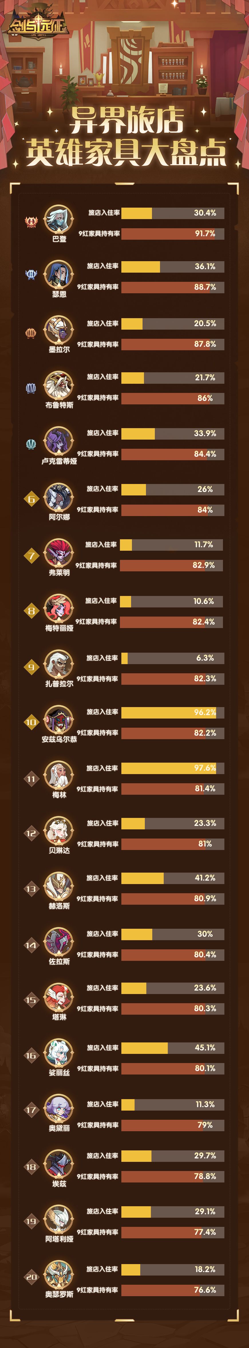 九红家具持有率越高,表示该英雄九件传说级专属家具的养成率越高。