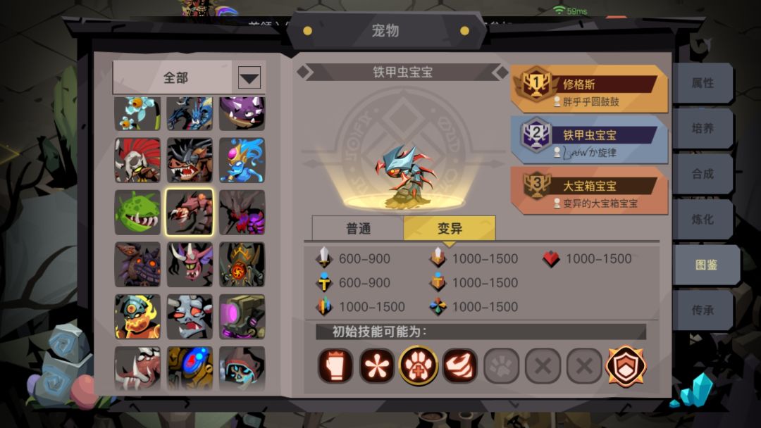 每天可以获得0-4个重生果实。已经变异穿山甲的可以积攒下来不少。变异穿山甲后也需要技能,这里推荐图三的铁甲虫宝宝。
