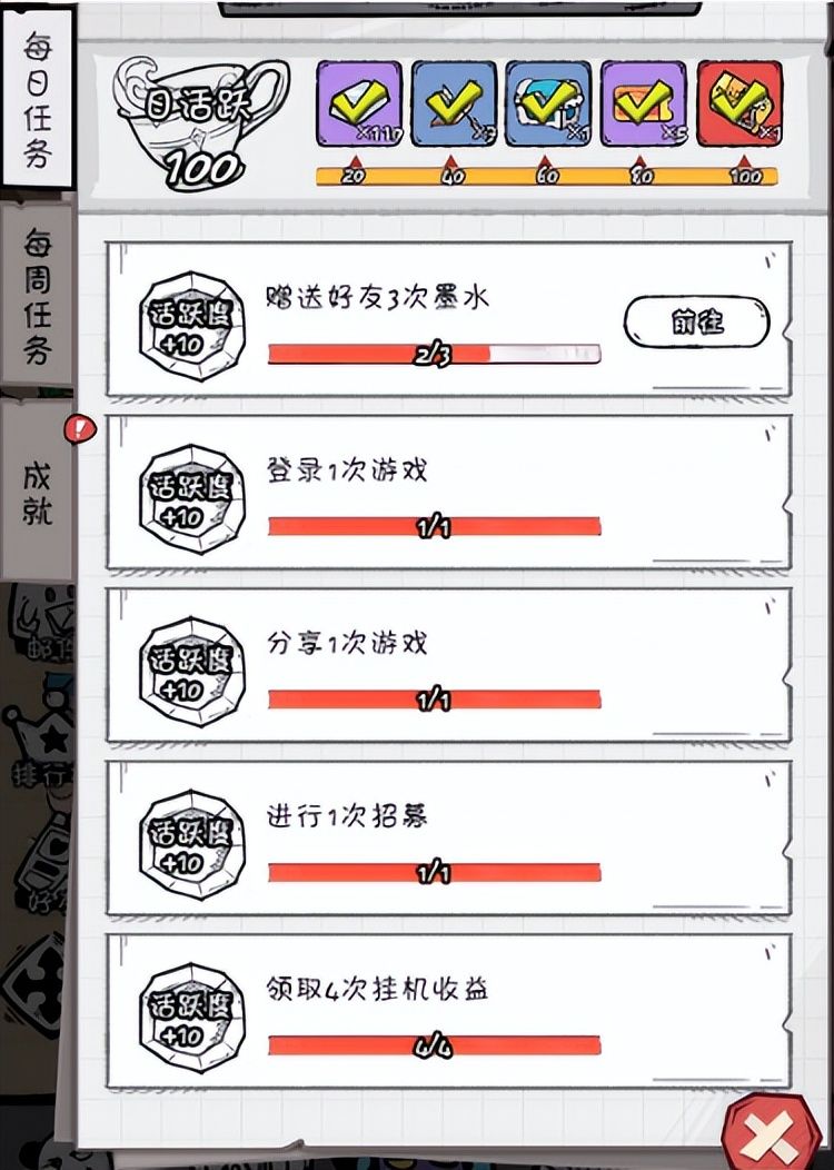 除了日常任务外,还可以通过领取挂机收益来获取更多资源。建议将观看视频的次数拉满,以便获得更多收益。此外,在每天免费获取3次墨水之外,还可以用彩钻购买额外次数。阶段奖励还可以领取到蓝宝箱、solo券、招募卡等奖励,活跃度达到100就可以领完全部奖励。结语通过参与日常任务并合理利用各种机会获取奖励和资源,将有助于提升游戏体验和角色实力。所以不要错过每天完成日常任务的机会哦!这期就分享到这了,小编会继续分享更多关于《火源战纪》的精彩爆料、玩法技巧,以及阵容搭配。我们下期不见不散,一起相约《火源战纪》。