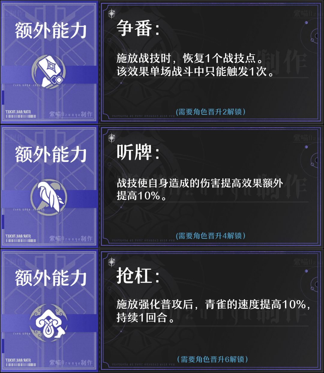 青雀的战技是天赋机制体系的关键触发器,分为抽牌、增伤、额外行动两个部分的效果。