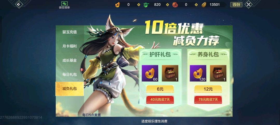 降临大荒的时候,我们当然要先完成新手任务,在放置家园后,我们就可以开始利益最大化快速成长,首先我们需要在第一天首充36米,分别为减负礼包→护肝礼包6米,其次为月卡。充值后的护肝礼包在邮箱领取后,自选三样首选清蒸帝王蟹宴,可以快速辅助我们升级到30级,另外两个一个选灵韵自选,另一个选取无限鸿运礼包,运气好的欧皇可以获得无限血蛋哦。首充礼包中选择定海神针,虽然缺一个仙人指路,无法发挥最强输出,不要怕,我们要以最低代价快速发展,我们要白嫖!接下来加入一个自己喜欢的氏族,进入氏族后我们就可以获取氏族资金,这是白嫖灵韵福利最大来源哦,每天氏族资金有2000上限,我们要把这个全部做满。