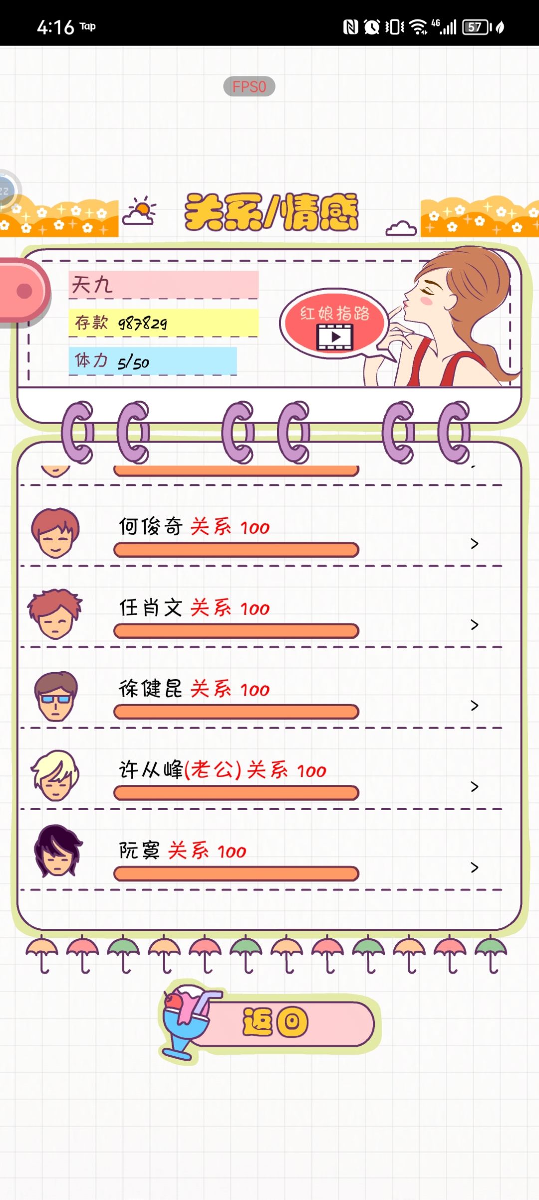 大学期间安慰失恋室友会结识苏婷婷、高中同学刘郁宁(俺第一档老公,他好穷)、去多了社团结识学长顾冷琛(他好帅,但为了小许忍痛割爱)。认识新人后要隔2-3个月时间刷一次最便宜的外出活动,保证数值不是0。