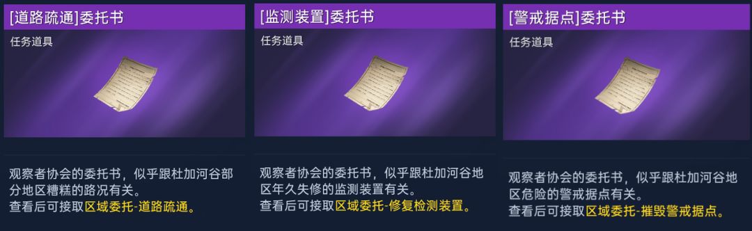 幸存者累计一定探索值后,可获取特定类型的观察者协会委托书,使用后即可接取该种类的区域委托任务。