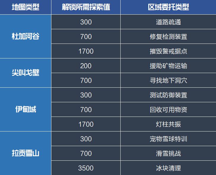 目前游戏有以下8种探索类型,其中区域委托、限时训练和探秘寻宝将在后文详细介绍。