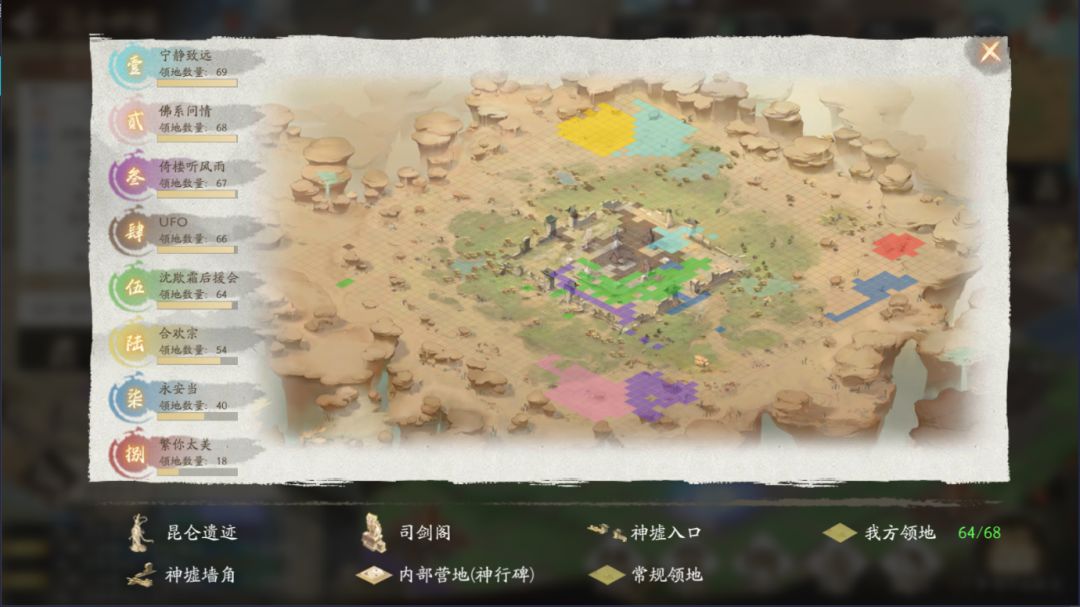 功能型地块有 神墟大门、神行碑、司剑阁、墙角、以及最重要的昆仑遗迹(最中间的那个)