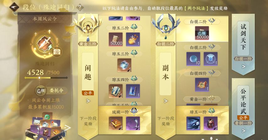 五江湖缘起:任选两个模式都可在达到黄金一阶/琼玉三阶/琼玉五阶/琉璃一阶/宗师五阶,获得金色内功!
