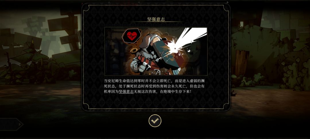 可以理解为王者里面的名刀但是是一次性的,受到致命伤害不会立刻死亡,而是丝血,再一次受到伤害才会死。坚强意志几乎无法触发,很难测试真实几率,这种濒死状态搞不好就直接减员了,然后重新招募、重新养起。