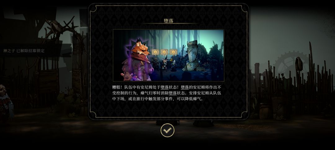 3.这里要谈到一个很关键的设定就是瘴气,我喜欢叫它堕落值,这个是相当于一个负面状态的进度条,攒满紫色堕落值会有一个机会超越或者堕落;攒满灰色的堕落值会直接清空自己的血条非常危险。超越,就是清空负面的堕落值强化自己的面板。堕落,就是会产生想象不到的随机负面状态,比如队友回血他不接受(无法选中)。