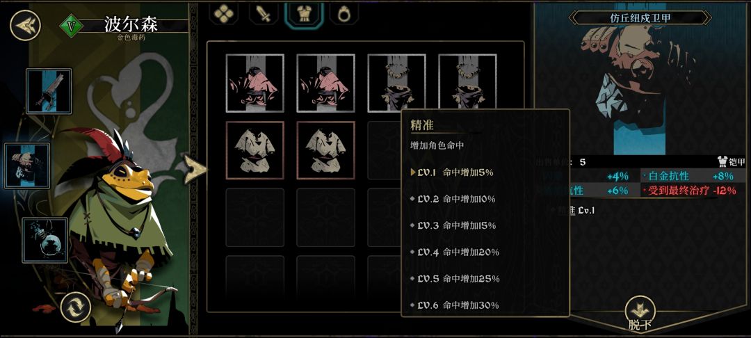 拿到蓝色装备后将会附带一些小特效,这里实际已经对战斗的影响开始体现了,比如我3件套加速度的,就能超过恶心的压力怪先手秒人,良性循环下来我中期甚至0压力过日常小任务,保底的下限奶妈也可以超速怪抬死门,所有跟输出挂钩的属性,命中是第一条,战斗里一个miss有多恶心大家应该也有所体会了,(点名鸡哥,4连击会被暴击和miss打断,输出是真的高,难受也是真的难受)