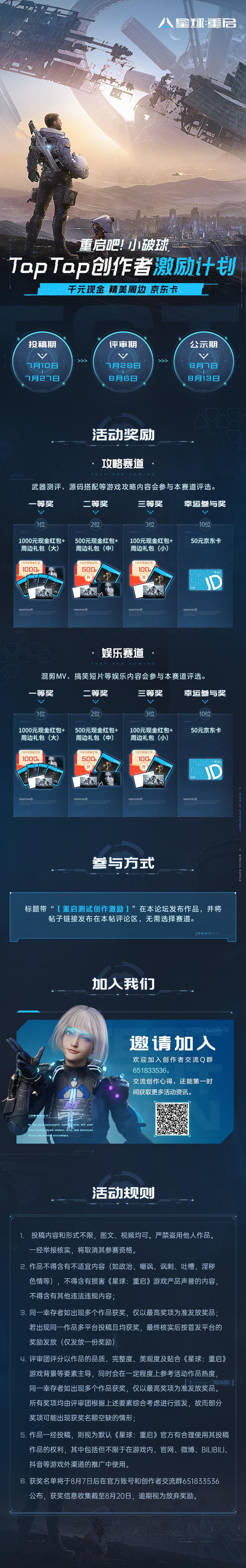 参与方式也非常简单,只需标题中带“【重启测试创作激励】” 在本论坛发布《星球:重启》相关作品就有机会获得千元现金、精美周边等奖励。活动详情请看↓