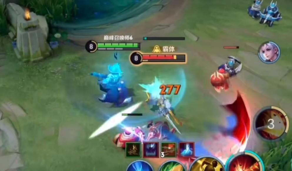 这时候是关键,立刻大招霸体+蓄力吃对方的伤害,然后反手再开3技能打在敌方残血脆皮的脸上,最后2技能潇洒离去,如果敌人再追就1技能把他推走。