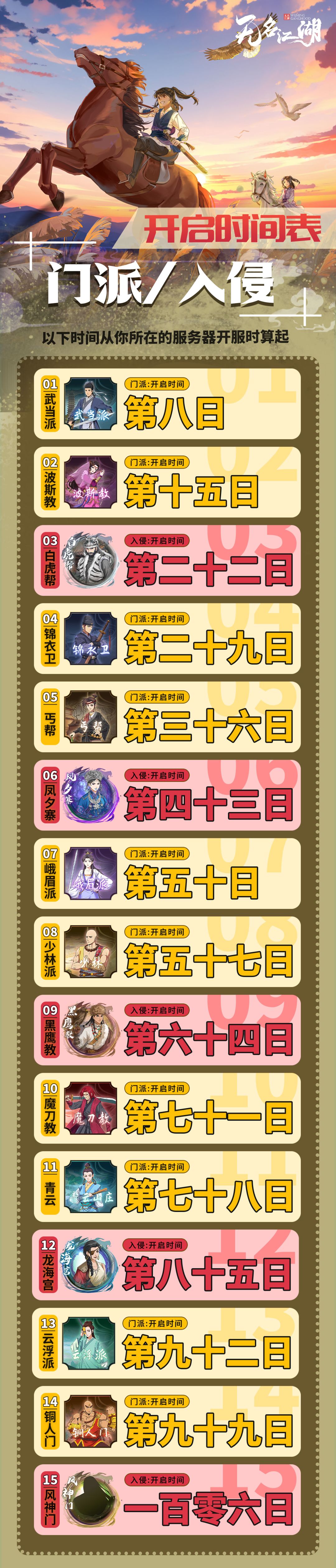 为各位少侠整理了服务器开启后,门派和强敌入侵活动的开启时间表,以便大家查询哟~