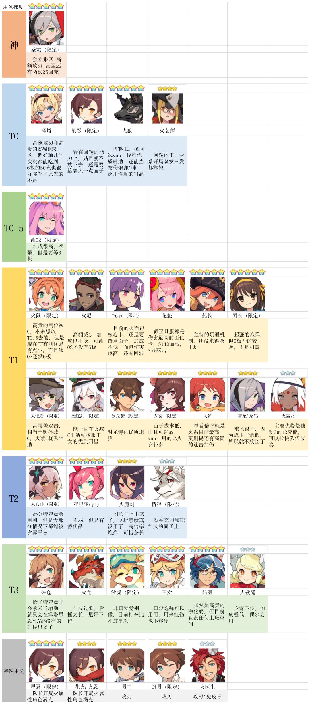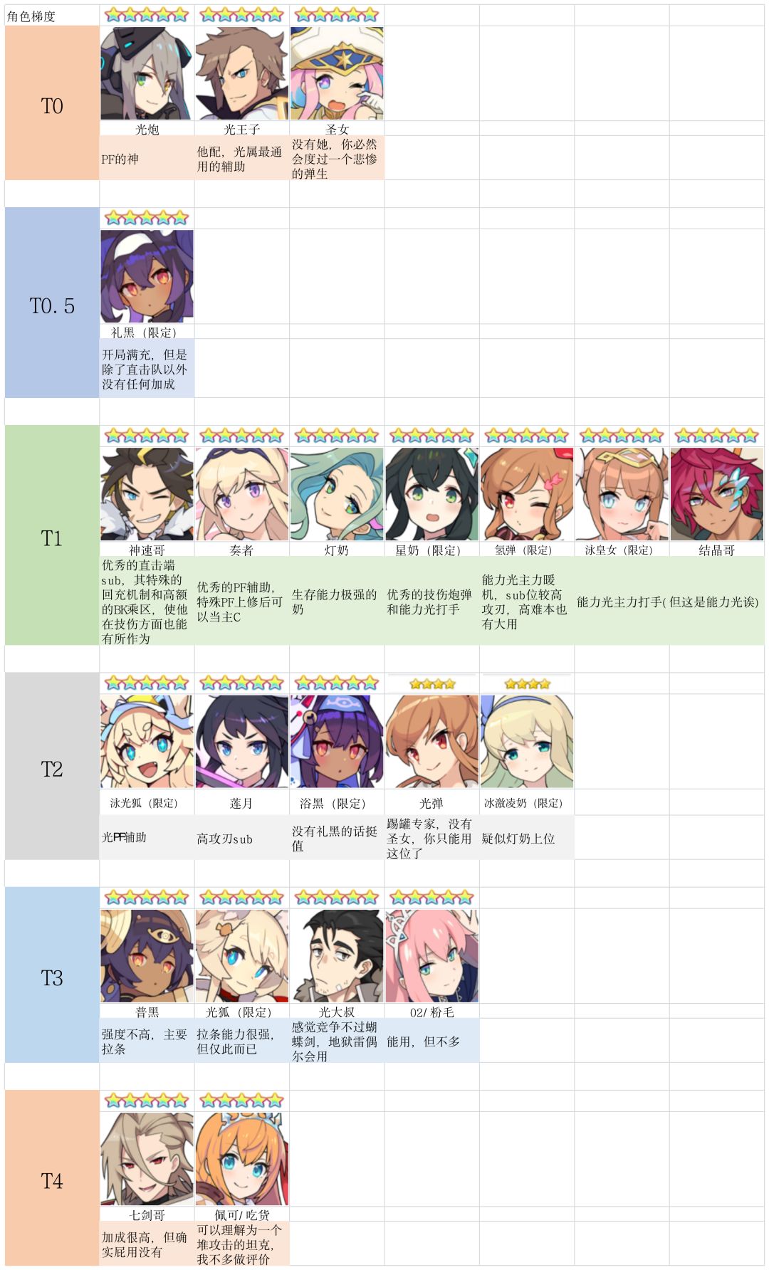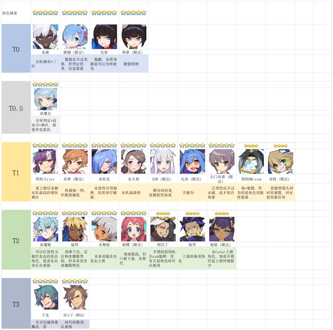 考虑到本次联动可能又有新的小伙伴入坑,我就在群友大佬们的帮助下做出了一些角色的梯度图,包括了基本上所有五星角色和部分上场频率较高的三四星角色,方便给刚入坑的小伙伴们一个参考,同梯度角色排名不分先后。
