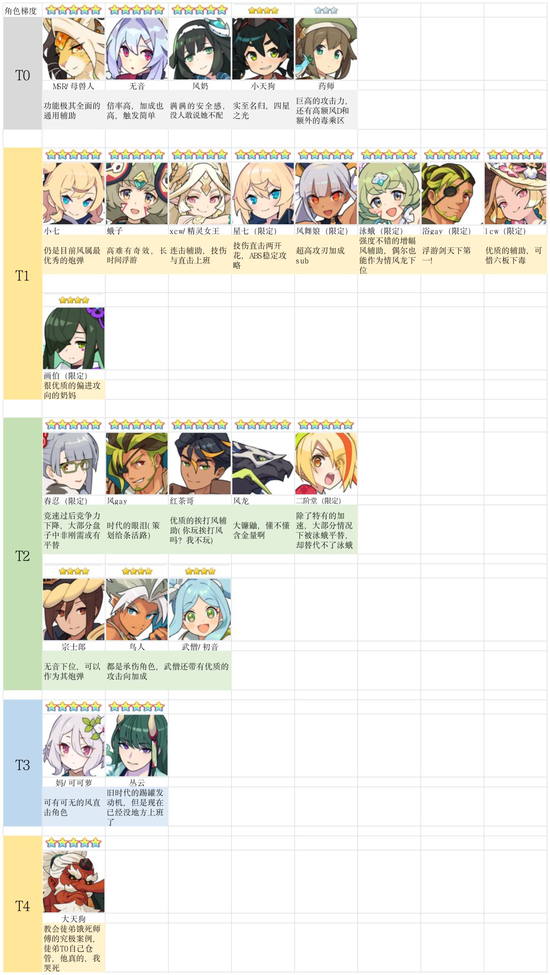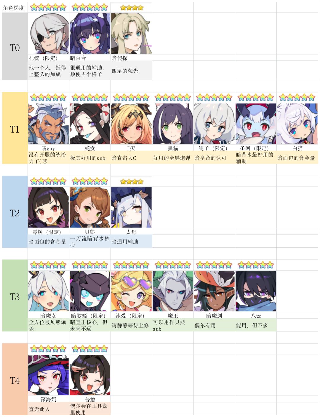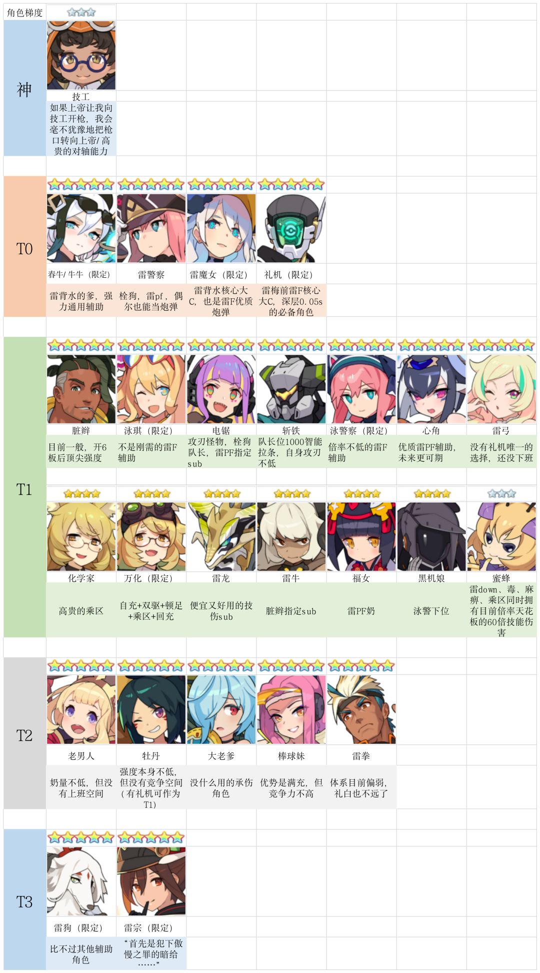考虑到本次联动可能又有新的小伙伴入坑,我就在群友大佬们的帮助下做出了一些角色的梯度图,包括了基本上所有五星角色和部分上场频率较高的三四星角色,方便给刚入坑的小伙伴们一个参考,同梯度角色排名不分先后。