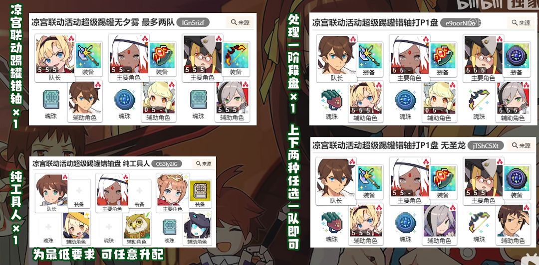 本次活动的难度并不高,基本上所有技伤角色都可以上场带队并且通关时间均在2分钟以内,如果小伙伴们刚刚入坑没有火技伤的完整队伍那么推荐组工具人找大佬带着踢罐哦。