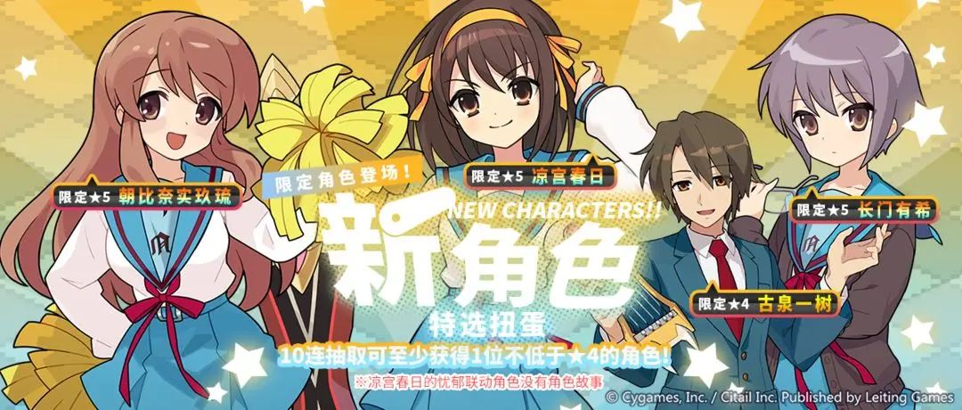 hello大家好啊这里是六月就新建文件夹然后昨天才开始做图的躺躺猫,大家期待许久的凉宫春日联动终于要迎来实装了,本期攻略贴内容包括凉宫春日的相关活动攻略以及躺躺猫和群友们自制的角色梯度榜两个部分,希望可以给各位提供一个参考。