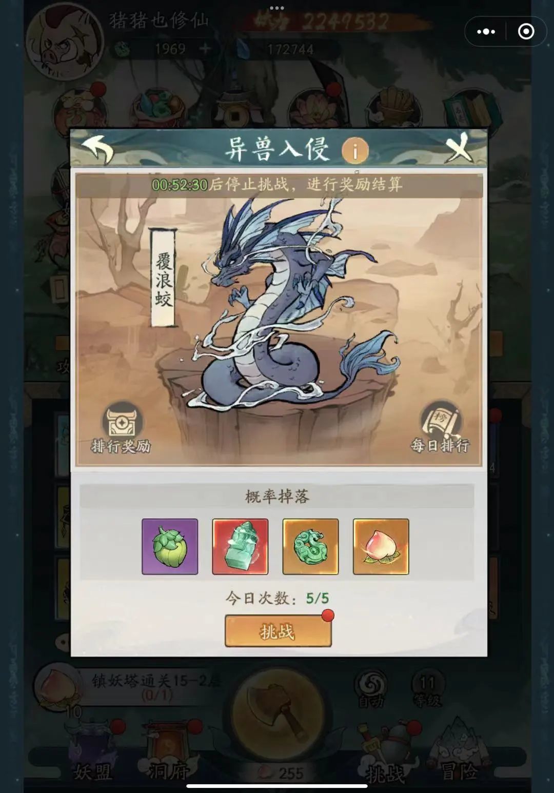 桃子获得:根据妖王挑战阶段计算,如图 60*5=300颗;