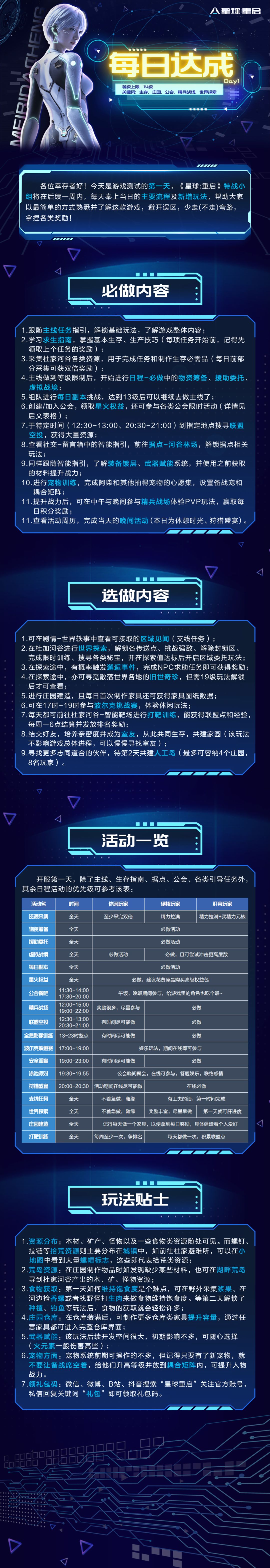 今天是游戏测试的第一天,《星球:重启》特战小组将在后续一周内,每天奉上当日的主要流程及新增玩法,帮助大家以最简单的方式熟悉并了解这款游戏,避开误区,少走(不走)弯路,拿捏各类奖励!