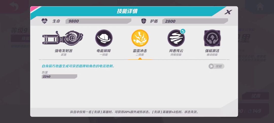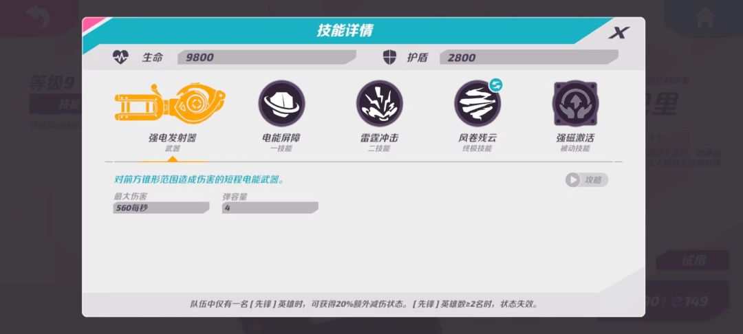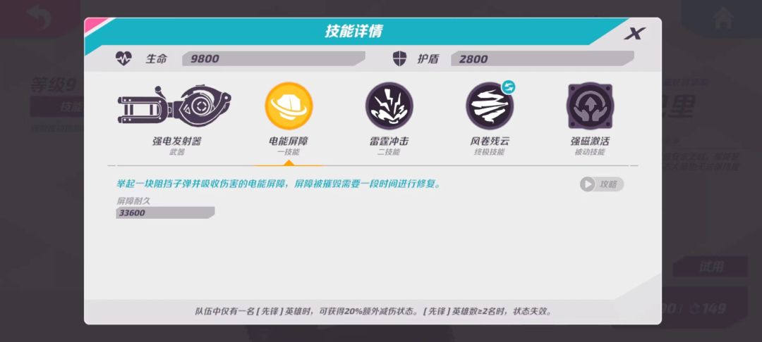 技能描述:举起一块阻挡子弹并吸收伤害的电能屏障,屏障被摧毁需要一段时间进行修复。