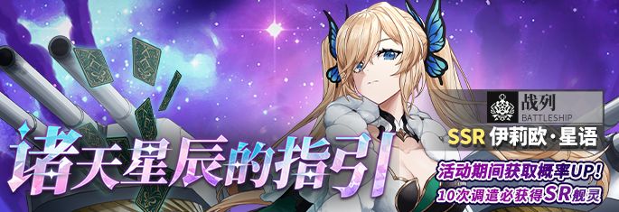 指挥官可在「活动调遣-诸天星辰的指引」中使用「紧急调遣证」获取限定SSR舰灵「伊莉欧·星语」,活动期间该角色的获取概率也将大幅提升!