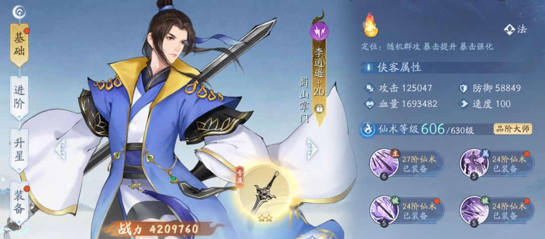 上图是同样侠客只穿戴了一件绝世衣服;可以看到防御增加了1125点,血量增加了27884点;衣服的基础属性是防御916,血量是15705;所以装备穿戴到侠客之后会受到各种因素的加成,比如丹药、皮肤、称号等;再强大的侠客身上红装的优势更加明显。具体算法自行探索。以下是同一账号有仙术、等级、进阶、星级同一侠客穿戴一件普通绝世·法衣的前后数据对比:
