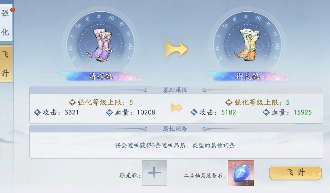 S2装备飞升就需要一个同部位“普通红装”+二品仙灵装备石;可看到基础属性提升,还有会获得随机的3条品质、类型的属性词条。详情看下图: