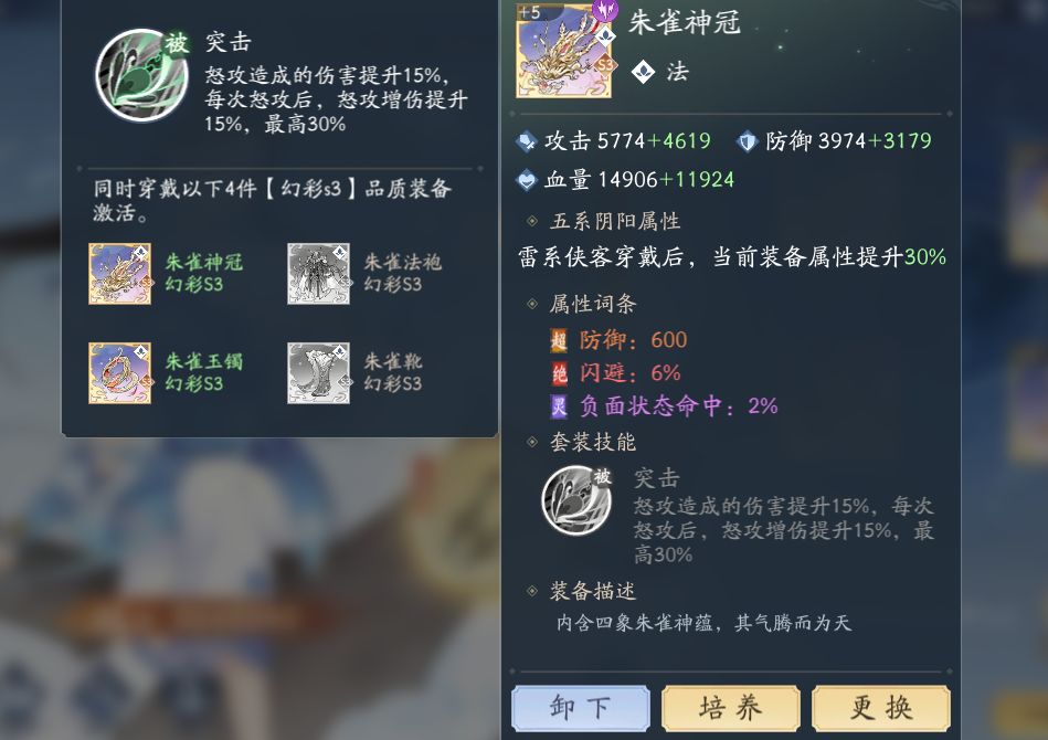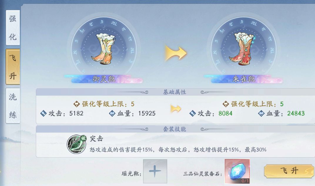 S2飞升S3需要同部位普通红装+三品仙灵装备石;装备增加基础属性并获得一个套装技能(套装技能需要四件S3才能激活)