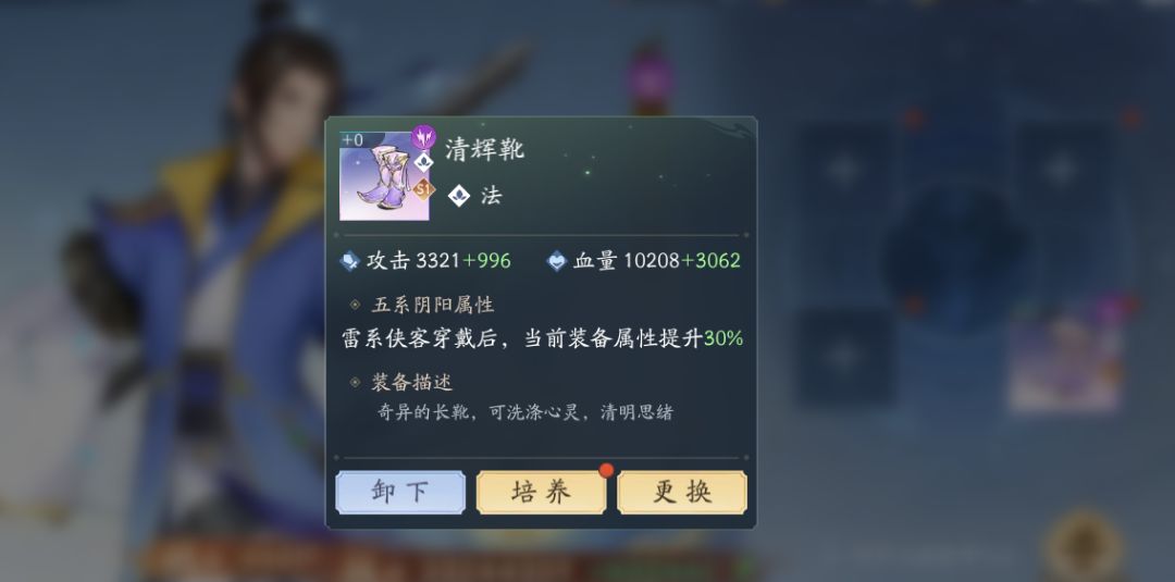 大家可以看到装备除了强化之外还有一个功能就是飞升,需要一个同部位红装(绝世装备)+一个一品仙灵装备石可进行飞升为清辉法袍(俗称S1装备)注意除了基础属性提升以外还会随机获得一条:风 雷 水 火 土 阴阳,及对应侠客携带当前装备基础属性还要提升30%。这个是什么意思呢?请看下图: