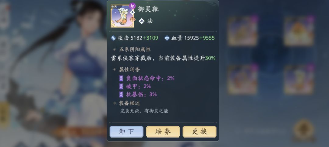 关于装备洗练的建议为:S2只洗出对应系别即可,不用追求完美属性;洗练石需要屯起来洗阴阳·赵灵儿的装备速度 每个补位满速度为12 下图示例: