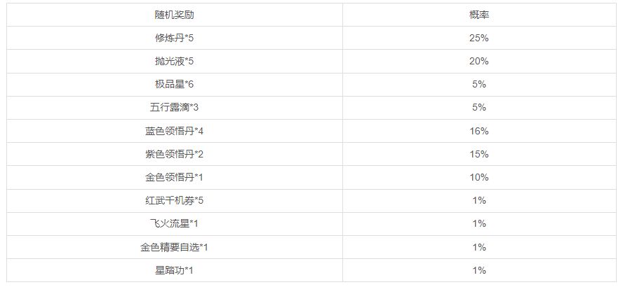 随机奖励:有概率可获得修炼丹、抛光液、极品星、五行露滴、蓝色领悟丹、紫色领悟丹、金色领悟丹、红武千机券、飞火流星、金色精要自选、星踏功;