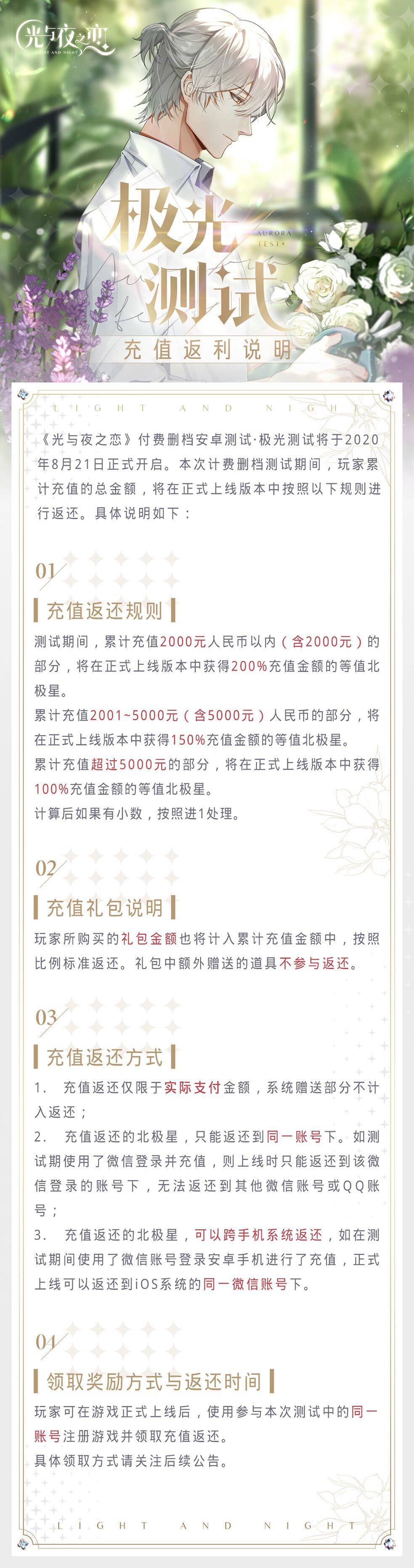 >>> 特别说明:极光测试期间将开启账号实名认证与防沉迷相关的功能组件。防沉迷健康系统将会对登录游戏时间与充值额度进行限制,具体说明可点击《光与夜之恋》手游极光测试开启健康系统的公告进行查看。